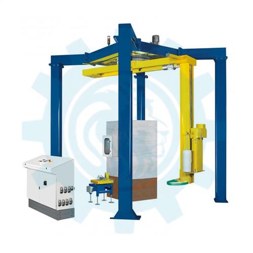 - یک قسمت از سلفون را به پالت متصل می کند و شما می توانید با فشار دادن دکمه روشن شدن بسته بندی محصولات را آغاز کنید. (این دستگاه برخلاف مدل صفحه گردان که پالت به چرخش در می آید دکل دستگاه به دور پالت می چرخد.)
